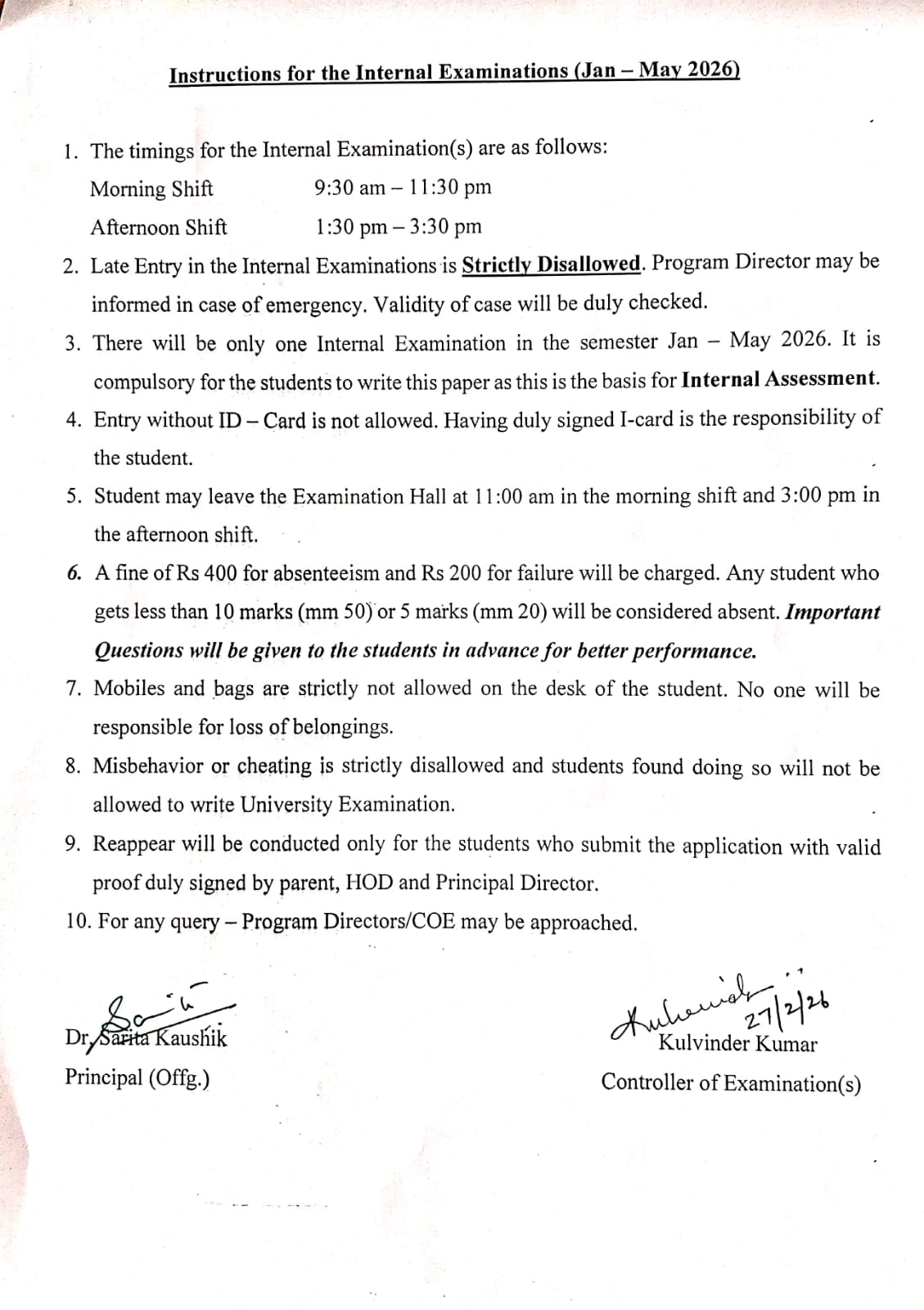 1. Date sheet and instructions of Internal Examination are uploaded semester wise on website for the information of students. If there is any change, students are well aware to check details time to time.