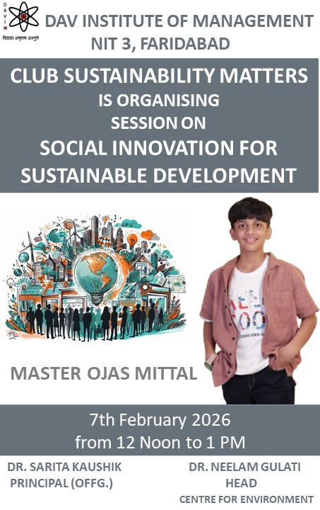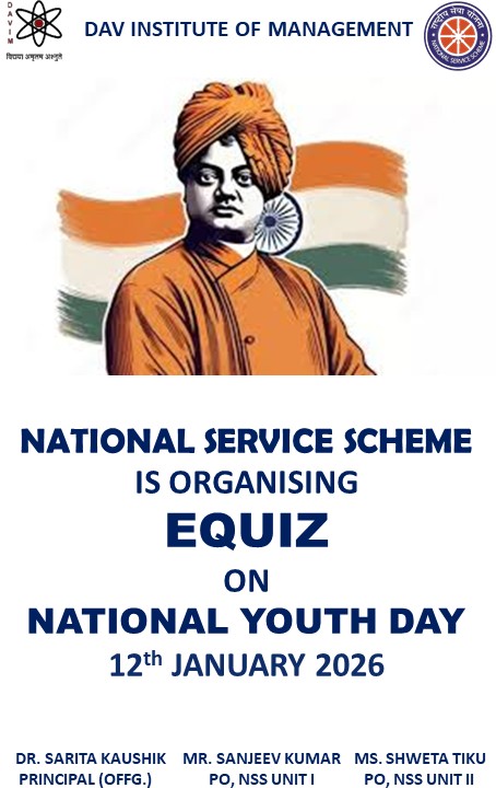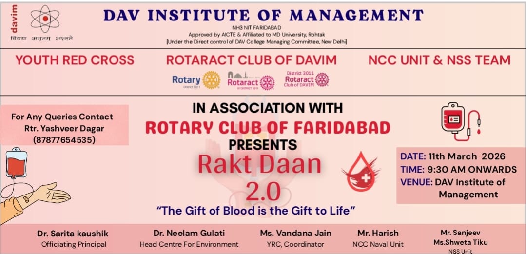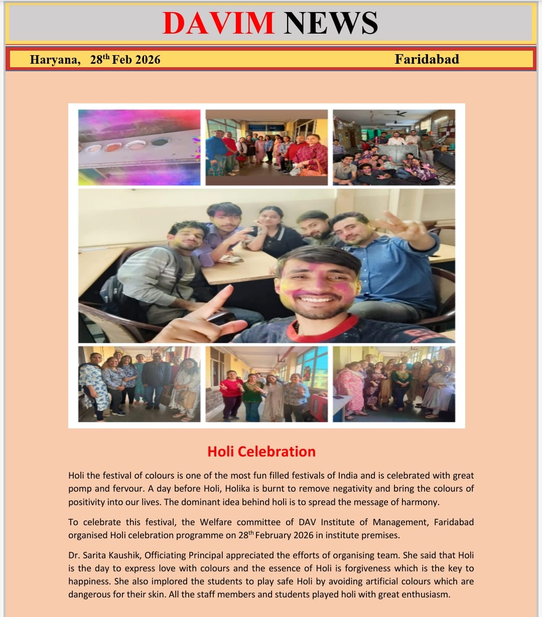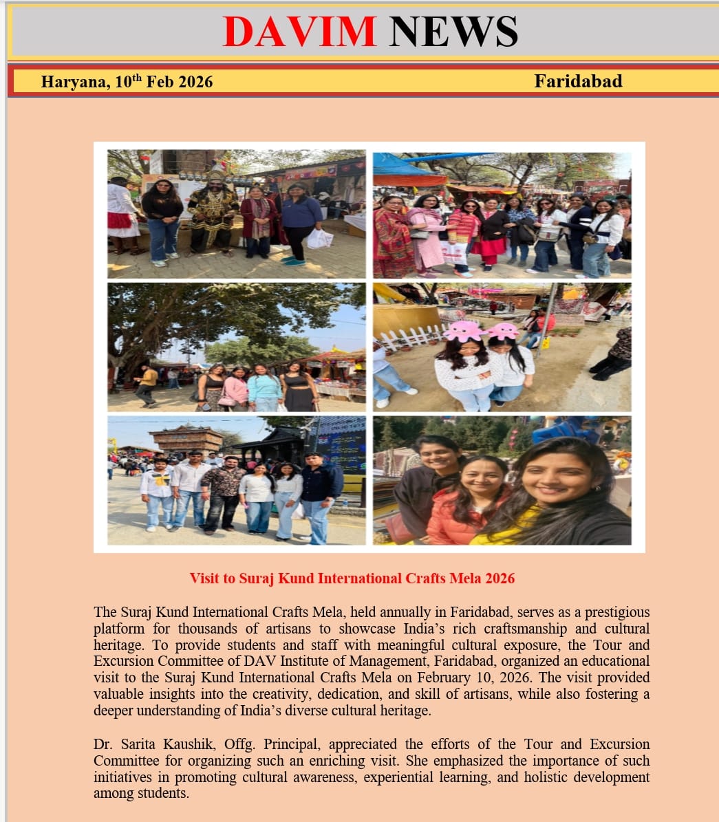 DAV INSTITUTE OF MANAGEMENT , CNCR (Faridabad) was established on 12th October 1997 by DAV College Managing Committee, New Delhi, with Vedic values embedded in the educational vision.