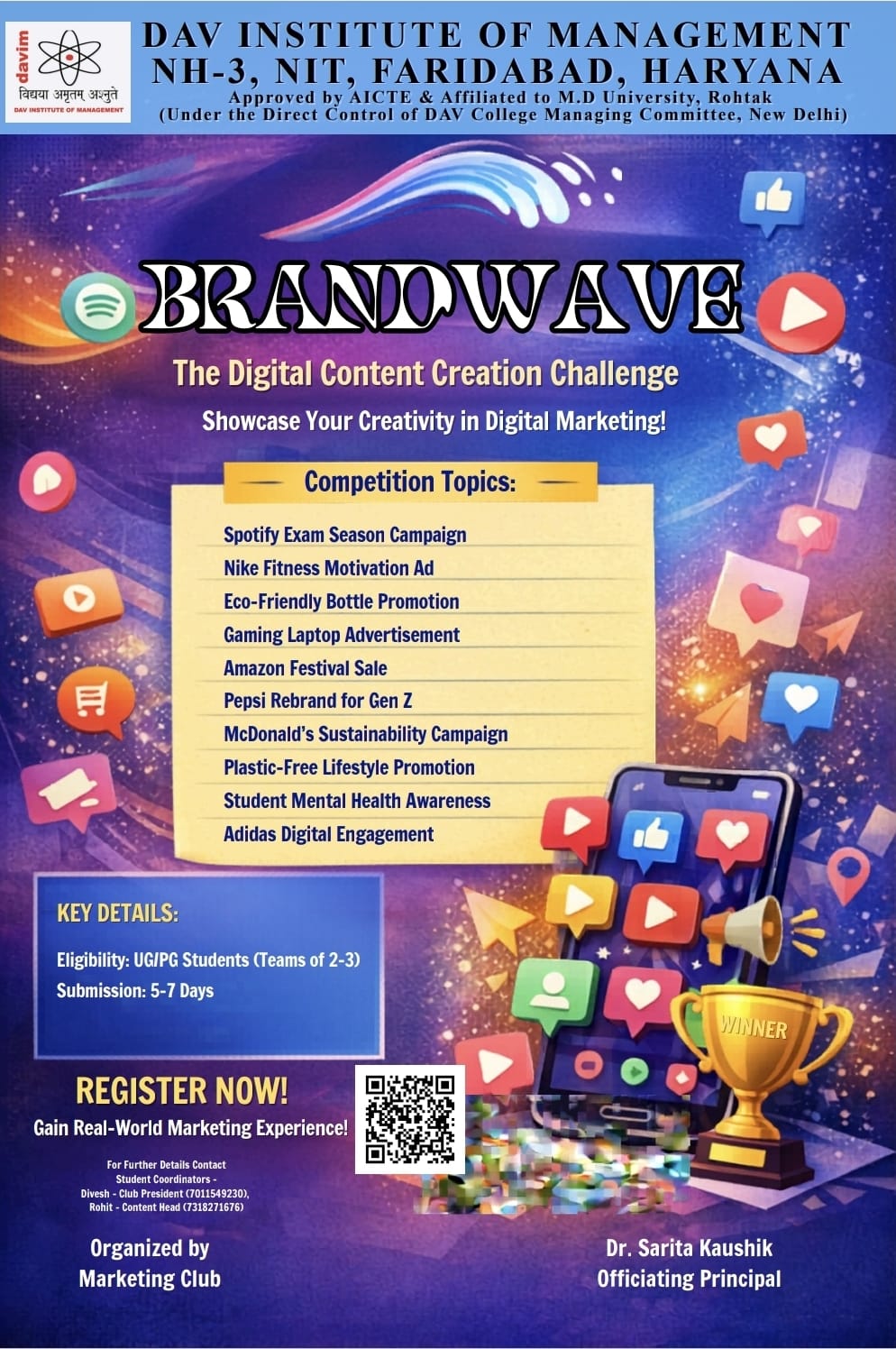 The institute is affiliated to Maharshi Dayanand University, Rohtak which is NAAC accredited with an institutional score of 80-85 percent. It is among the few most preferred institutions in CNCR for management & IT education.DAV Institute of Management started its functioning with its MBA program with a batch of only 30 students and 5 faculty members in 1997 and today it has catapulted itself to an excellent learning ambience in a span of two decades by providing 8 courses at post graduate and undergraduate levels.