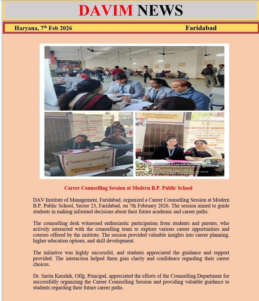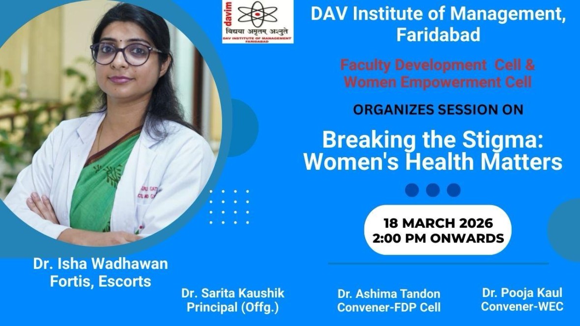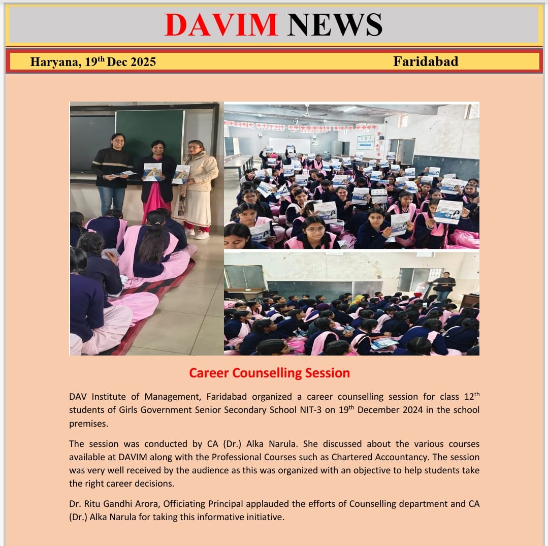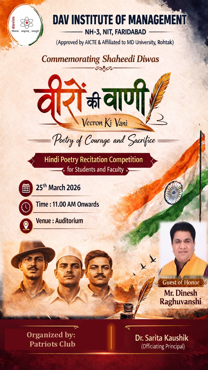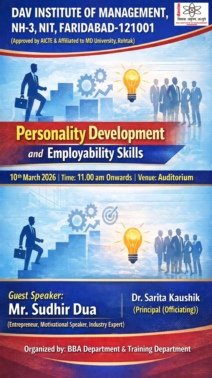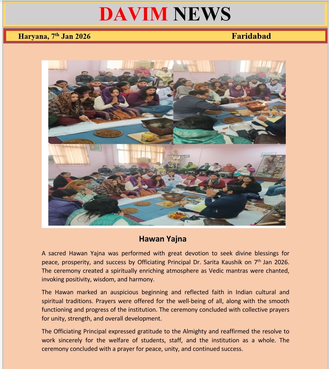 DAV INSTITUTE OF MANAGEMENT , CNCR (Faridabad) was established on 12th October 1997 by DAV College Managing Committee, New Delhi, with Vedic values embedded in the educational vision.