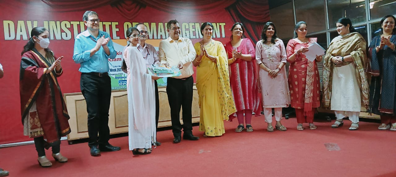 Department of Holistic Growth and patriots club at DAV Institute of Management conducted Vigilance Awareness Week-2021 with the theme ‘Independant India @ 75 : Self Reliance with Integrity’, under the aegis of Central Vigilance Commission. In this regard, Poster making competition, Declamation Competition and Poetry Recitation Competition were organized on the theme to promote moral values, ethics, good governance on 28th October. The competition was conducted in collaboration with NHPC Ltd. The event was graced by the presence of officials from NHPC Ltd. Mr R.P. Singh, Mrs. Shalini Mittal and Mr Rajesh Kumar. The programme was organised by Dr Rashmi Bhargava (Dean, Holistic Growth Department), Dr Anjali Ahuja (Convenor, Patriot Club) and team members Ms Neetu Juneja, CA Alka Narula, Dr Nidhi Turan, Dr Deepak Sharma, Dr Dhrity Ahuja, Ms Archana Mittal, Me Esha Khanna and Ms Jyoti Ahuja under the leadership of Principal Director, Dr Satish Ahuja.Poster Making Competition was judged by Dr Sunita Bishnoi and Ms Priti Bali. Poem Recitation Competition was judged by Dr Neelam Gulati and Dr Ashima Tandon and the judges of Declamation Competition were Dr Pooja Kaul and Dr Gurjeet Kaur.