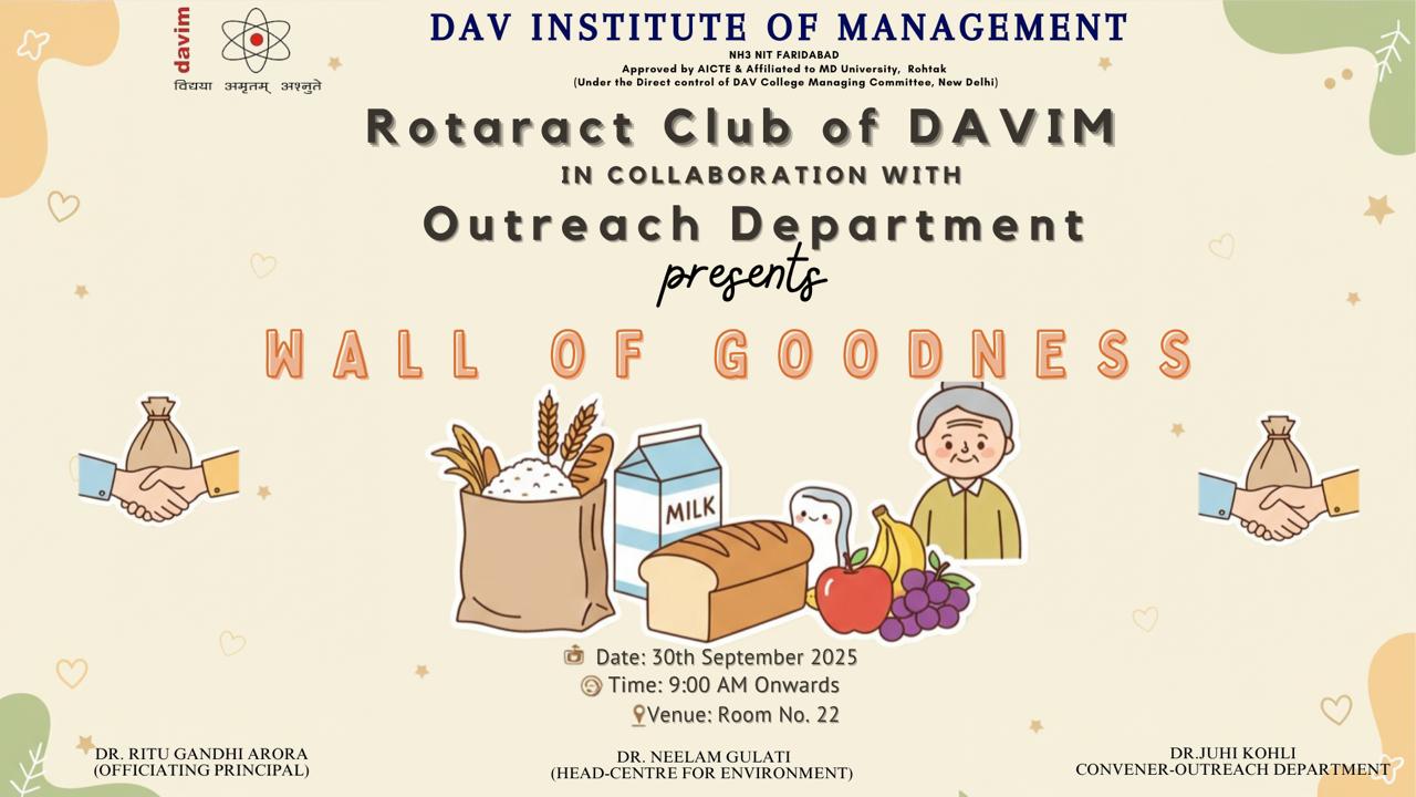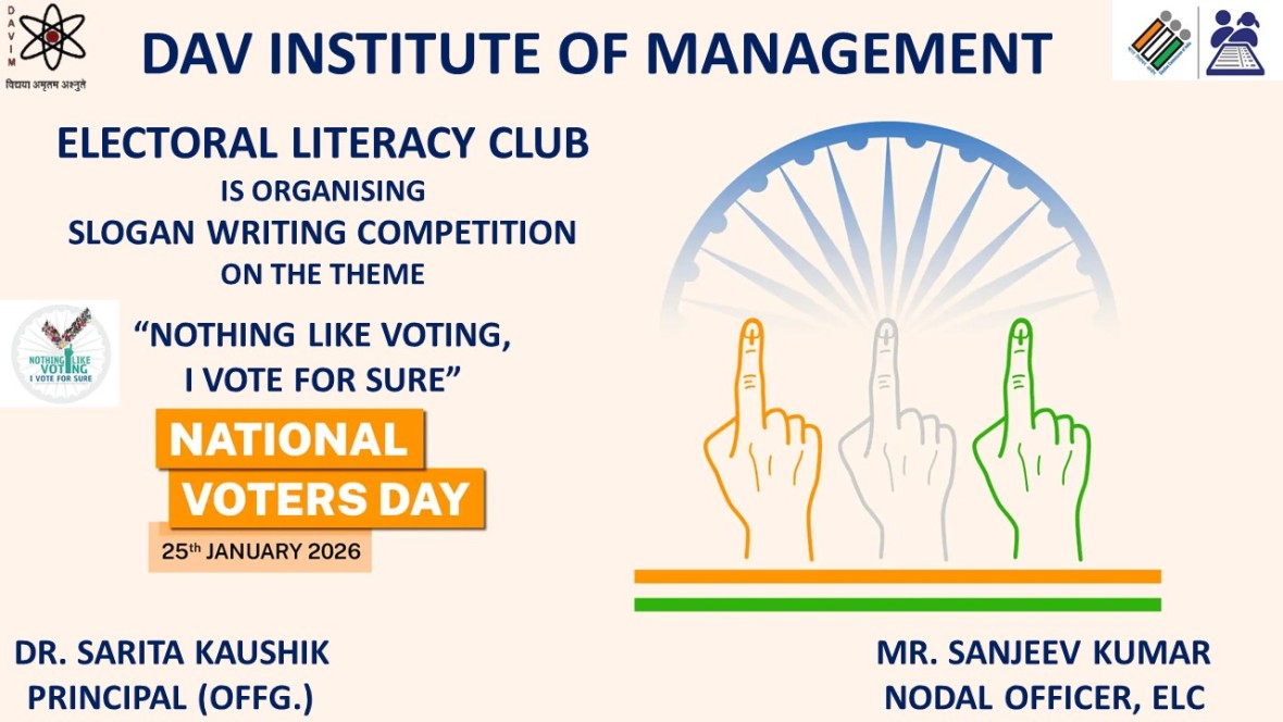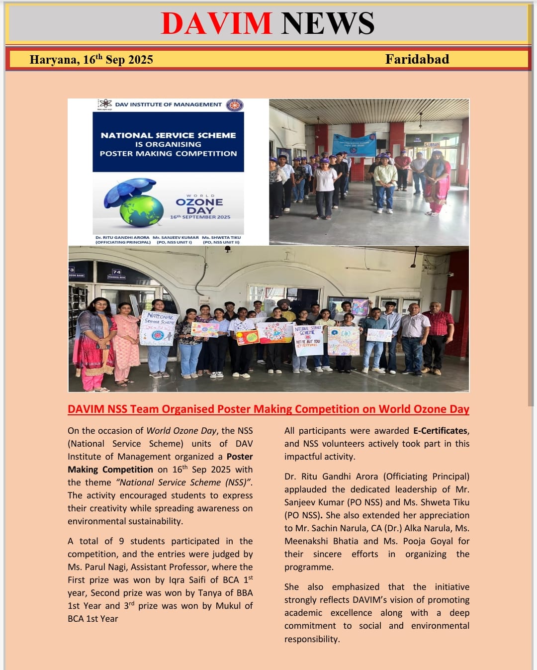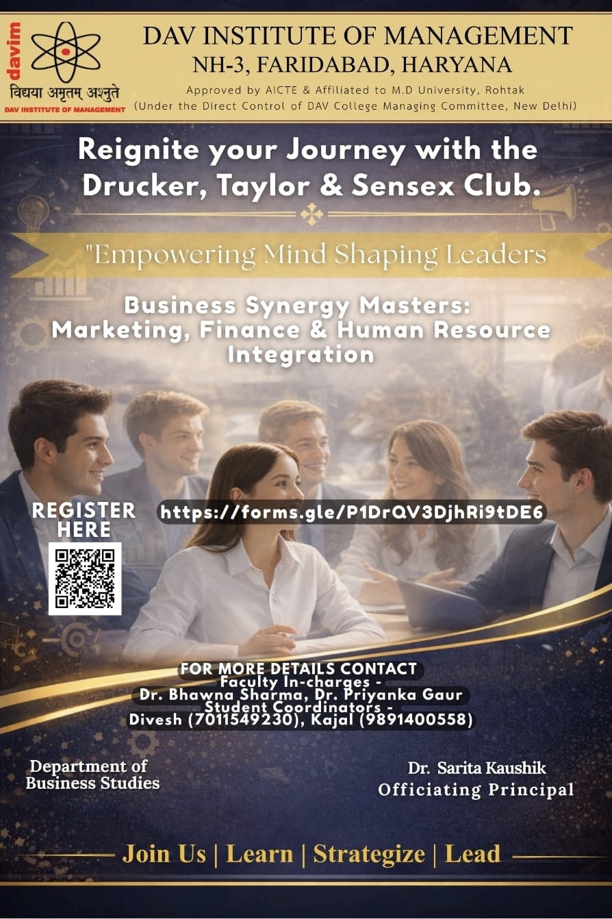 DAV INSTITUTE OF MANAGEMENT , CNCR (Faridabad) was established on 12th October 1997 by DAV College Managing Committee, New Delhi, with Vedic values embedded in the educational vision.