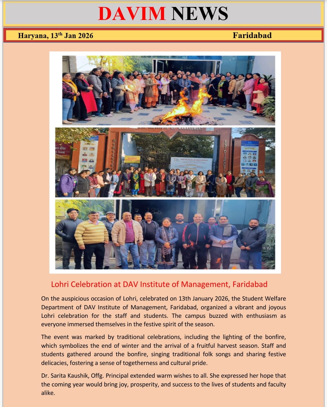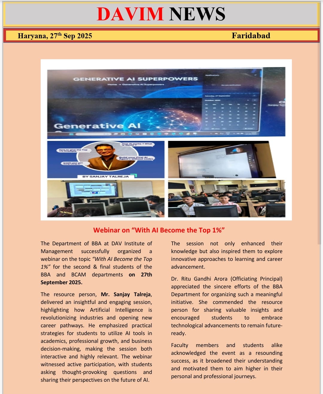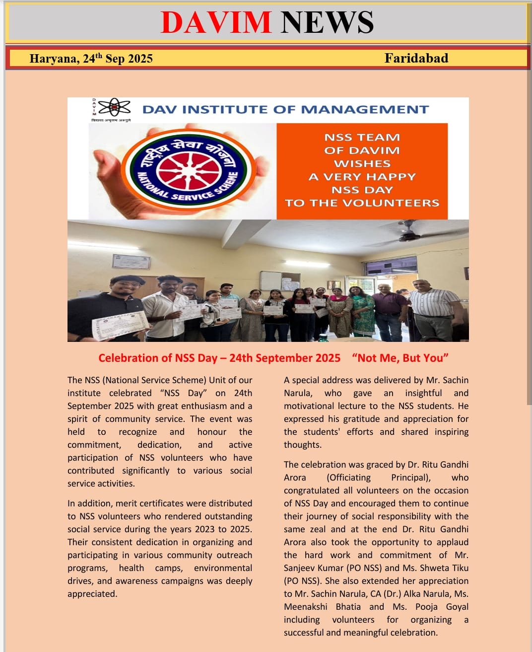 DAV INSTITUTE OF MANAGEMENT , CNCR (Faridabad) was established on 12th October 1997 by DAV College Managing Committee, New Delhi, with Vedic values embedded in the educational vision.